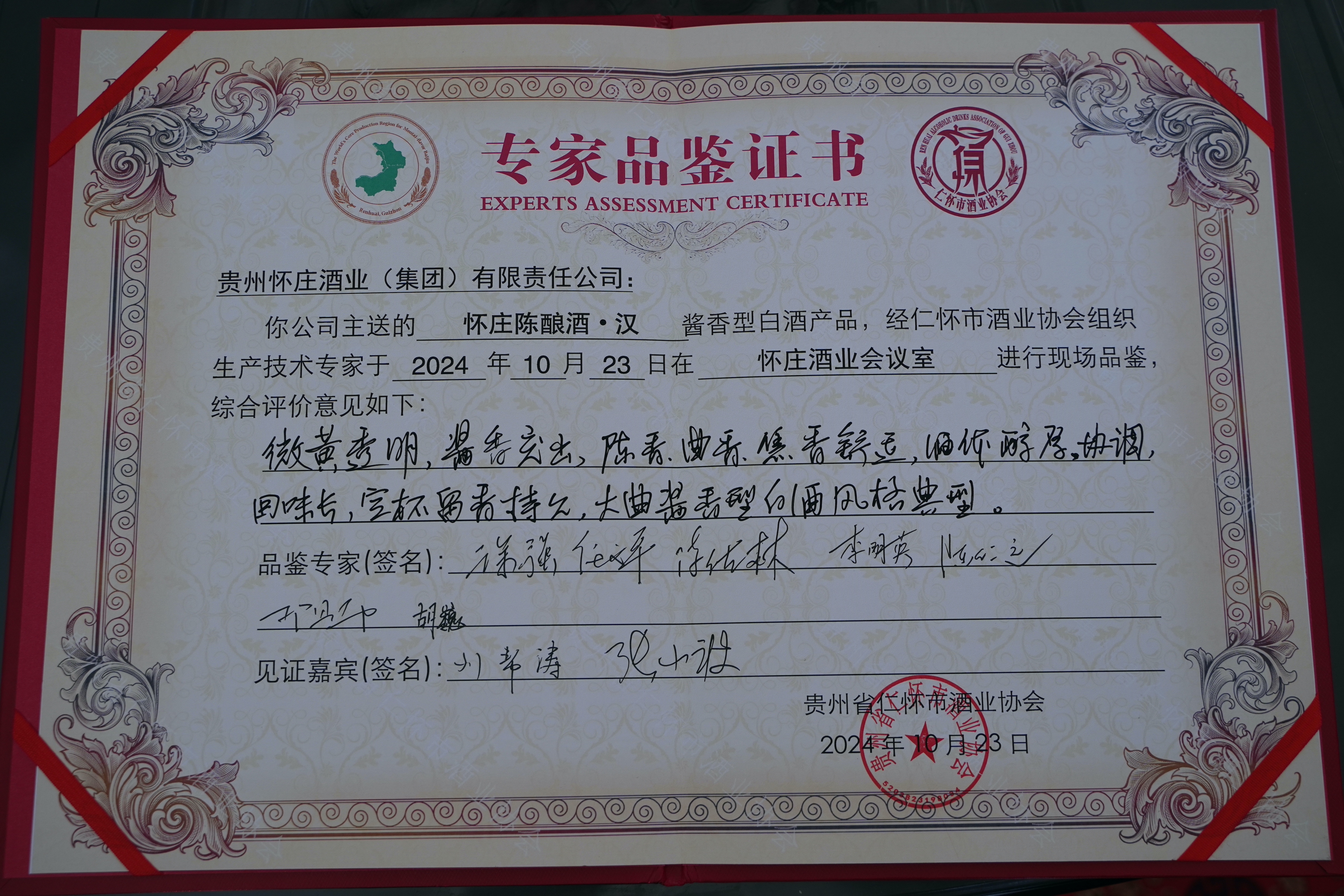 各位領導與專家在品鑒完懷莊陳釀醬酒之后 ,也對懷莊陳 釀做出了高度的評價: “ 微黃透明 ,醬香突出 , 陳香、 曲香、 焦香舒適 ,酒體醇厚 ,協調 ,回味長 ,空杯留香持久 ,大曲醬 香型白酒風格典型。 ”